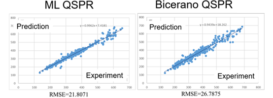 圖 4. 機器學習QSPR與傳統(Bicerano)QSPR的玻璃轉移溫度比較