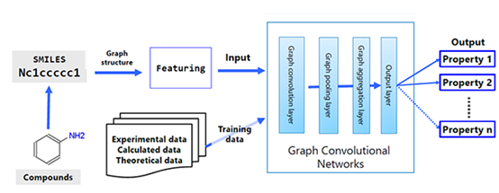 - 機器學習式 QSPR(圖 2,定量結構–性質關係):使用圖卷積神經網路 (Graph Convolutional Neural Network, GCN) 來學習並預測分子結構與性質之間的關係。